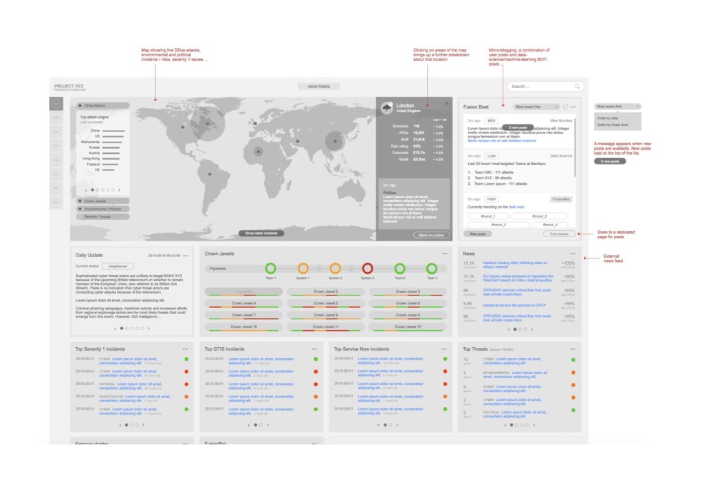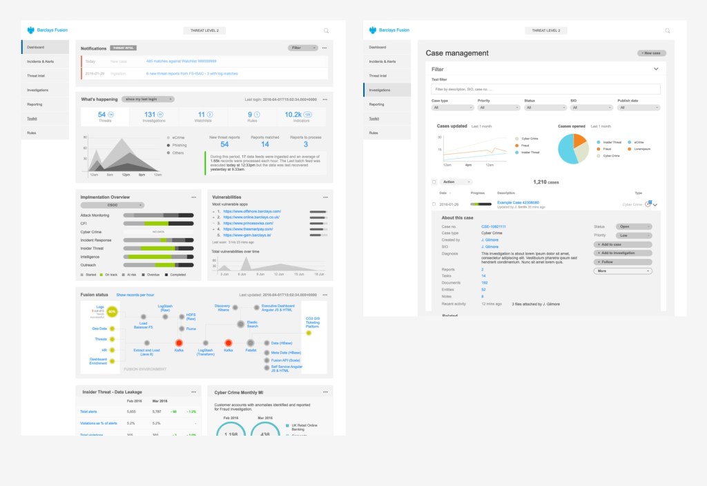 I was the Lead UX on a transformational project for the Barclays Chief Security Office, who identified their currently siloed approach to organisational security was not appropriate to deal with today’s complex security threats. Previously siloed “ vertical” teams (cyber, intelligence, physical security, resilience, fraud & investigations) were combined into one security function, which included round-the-clock global operational centres (with an 18 screen wall display). I led the UX for the design of the platform that was to be used to monitor security, and provide the tools for teams to collaborate. The designs had to scale from mobile, to desktop, to wall display (for the operational centres).