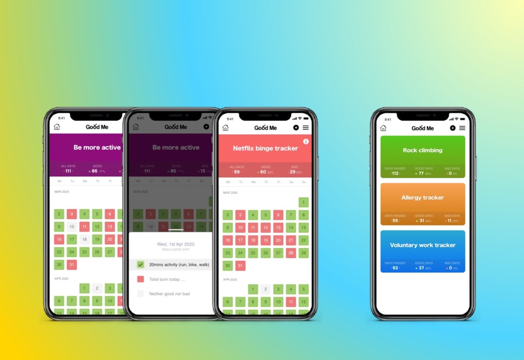 Goodme app is an iOS app aimed at behaviour-tracking. The key premise is that we, as humans, have bad habits we want to do less of, or good habits we want to do more of. But hindering our progress is laziness or procrastination … and a key weapon against this is motivation spurred on by a very visual view of your progress.