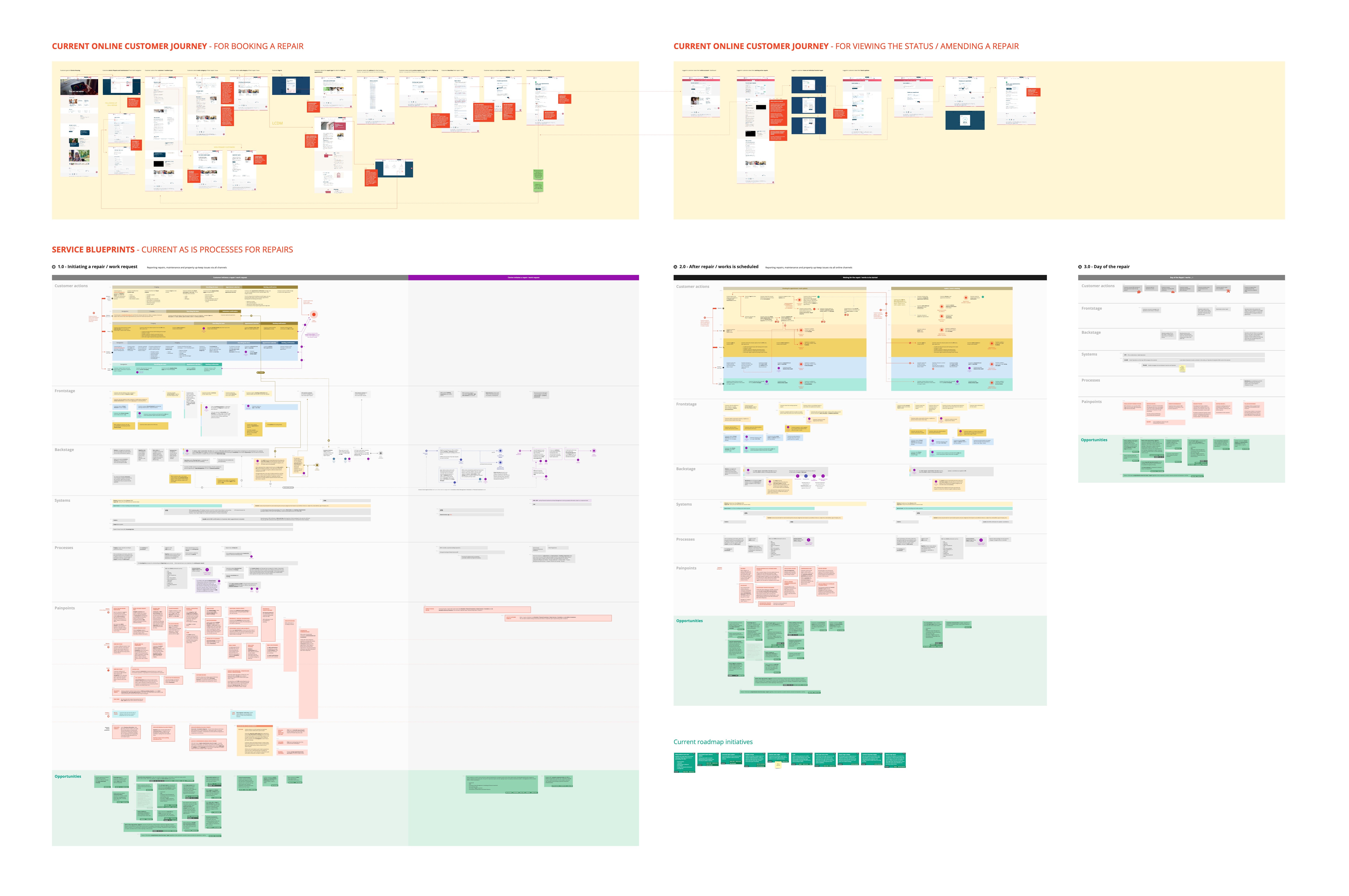 Working with the Product Manager and BA for the Repairs area, and the rest of the Digital Experience team, I undertook the research and discovery to collect and analyse information on the various existing processes. Interviewing stakeholders and going through existing documents to put together the blueprints.